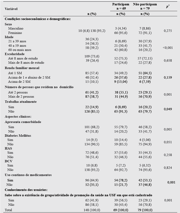 Resumen: Objetivo: Analizar los factores asociados con la participación de los usuarios de la atención primaria en las prácticas de promoción para la salud. Métodos: Estudio transversal de carácter descriptivo y analítico realizado en el municipio de Vitória de Santo Antão/Pernambuco en 2016 con 148 participantes con 20 años o más, registrados en las Unidades de Salud de la Familia o no en el proyecto de Extensión Cintura Fina. La recogida de datos se dio a través del cuestionario semiestructurado con los datos sociodemográficos, el perfil clínico, los hábitos alimentarios, además del conocimiento y participación en prácticas y actividades de promoción para la salud. Se realizó la asociación entre las variables a través de la prueba Chi-cuadrado de Pearson con el nivel de significación de p<0,05. Resultados: De los 148 participantes, el 76,4% (n=113) fueron entrevistados en las Unidades de Salud de la Familia y el 23,6% (n=35) en el proyecto de extensión con una media de edad de 52,9 años. Además, el 93,2% (n=138) eran del sexo femenino y el 57,4% (n=85) tenían la renta familiar de hasta un sueldo mínimo. La participación en grupos/actividades de promoción de la salud ha sido directamente proporcional al incremento de la edad (p=<0,001), la presencia de comorbilidades (p=0,005), al uso continuo de medicamentos (p=0,001) y el conocimiento de la existencia de grupos/actividades (p=0,001). En cambio, la participación se mostró menor en los que trabajaban (p=0,049) y vivían en domicilios con más personas (p=0,001). Conclusión: Las variables que se asociaron con la participación en actividades de promoción de la salud fueron la edad, la presencia de comorbilidades, el uso de medicamentos, el conocimiento de la existencia de prácticas educativas, el trabajo y el número de personas por domicilio.