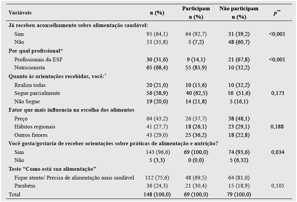 Em relação às variáveis relacionadas ao consumo alimentar, o recebimento de aconselhamento sobre alimentação saudável (p= <0,001) e essas orientações terem sido fornecidas por nutricionistas (p= <0,001) foram estatisticamente maiores entre aqueles que participavam de ações de promoção da saúde (Tabela III).