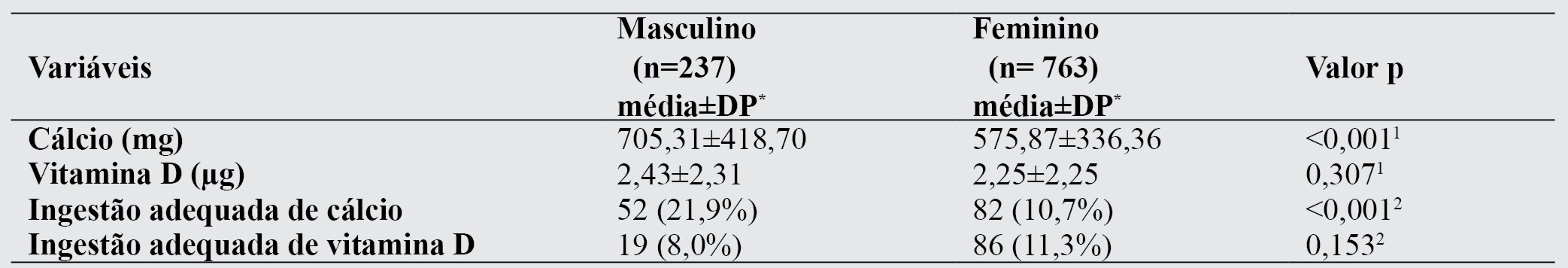 A Tabela I apresenta o consumo de cálcio e de vitamina D de acordo com o sexo, demonstrando que o masculino apresentou ingestão, significativamente, maior de cálcio em comparação ao feminino, enquanto o consumo de vitamina D não apresentou diferença significativa entre os sexos (p=0,307). Quando avaliada a frequência relativa de participantes que apresentaram ingestão igual ou maior à recomendação, foi observado que 21,9% (n=52) dos homens e 10,7% (n=82) das mulheres apresentaram ingestão adequada de cálcio, 8,0% (n=19) dos homens e 11,3% (n=86) das mulheres apresentaram ingestão adequada de vitamina D (p = 0,001).