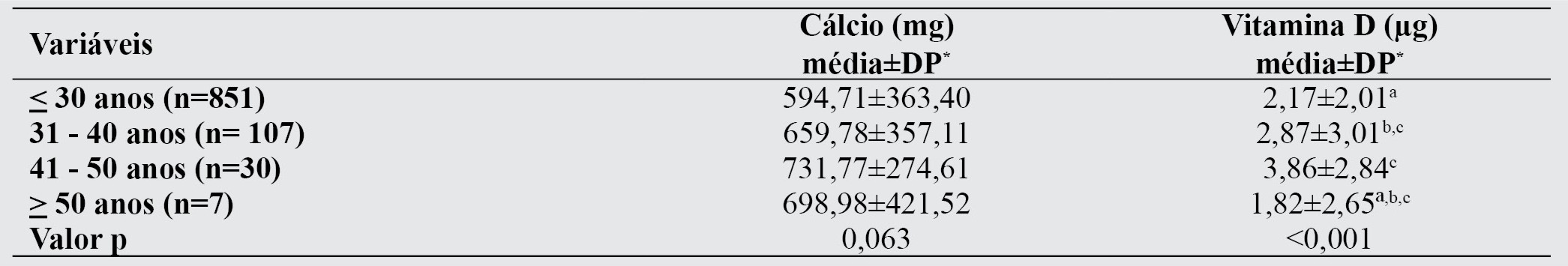 Os participantes foram agrupados em quartis de acordo com a faixa etária para comparação da ingestão de cálcio e vitamina D, sendo observada maior ingestão desses micronutrientes no grupo de participantes com idade entre 41 e 50 anos, conforme demonstrado na Tabela II. Os grupos diferiram significativamente quanto ao consumo de vitamina D, sendo observada uma tendência à diferença significativa no consumo de cálcio de acordo com a idade dos participantes (p =0,063).