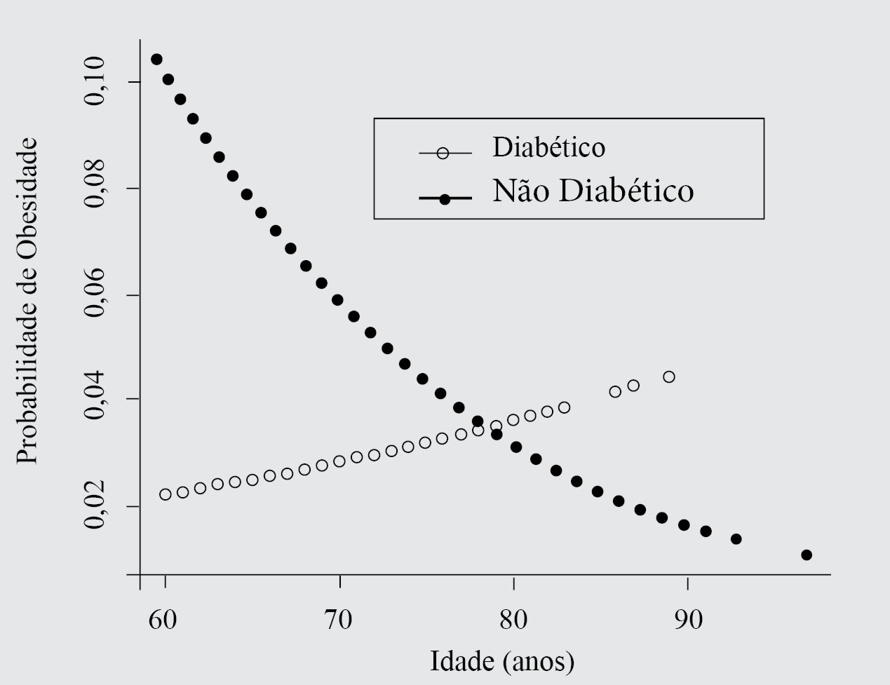 Além disso, existe associação entre diabetes e idade, indicando que a probabilidade de ser obeso aumenta com a idade entre diabéticos e diminui entre não diabéticos. Além disso, essa probabilidade é maior entre não diabéticos até os 79,5 anos de idade. A partir dessa idade, a probabilidade de ser obeso é maior entre diabéticos (Figura 1).