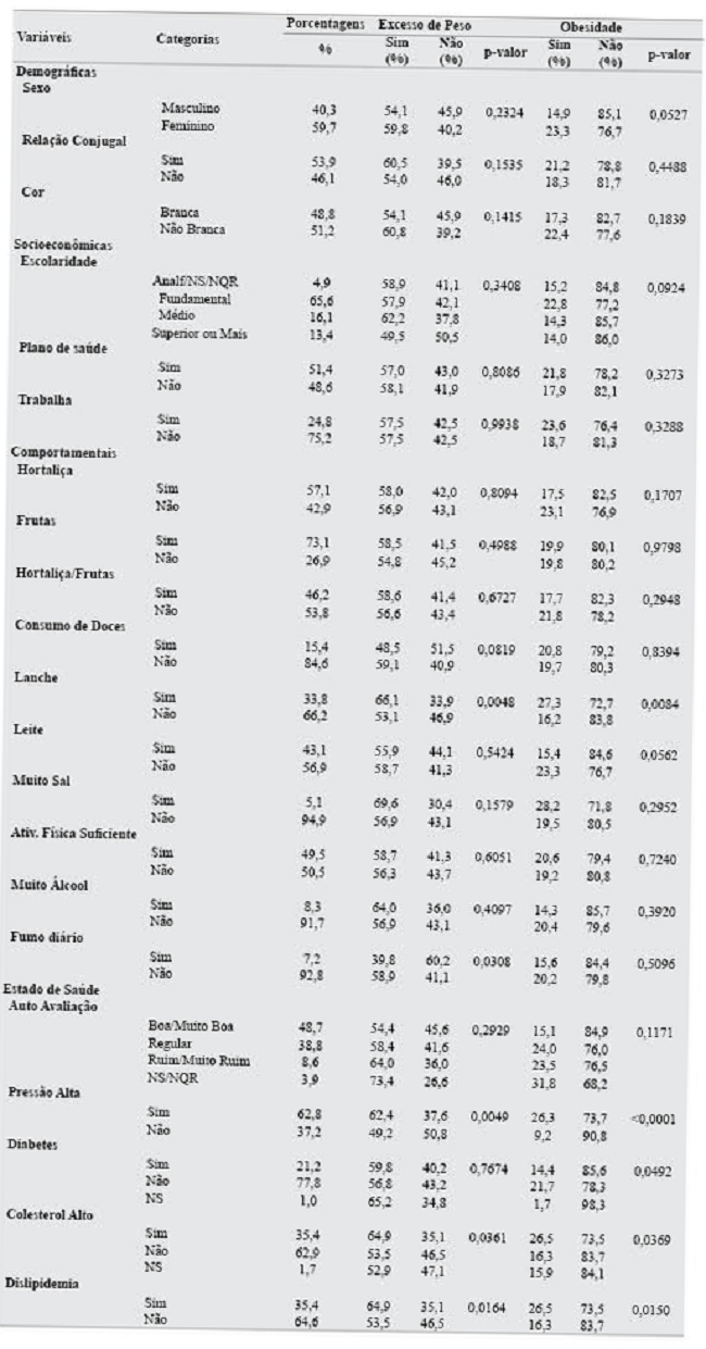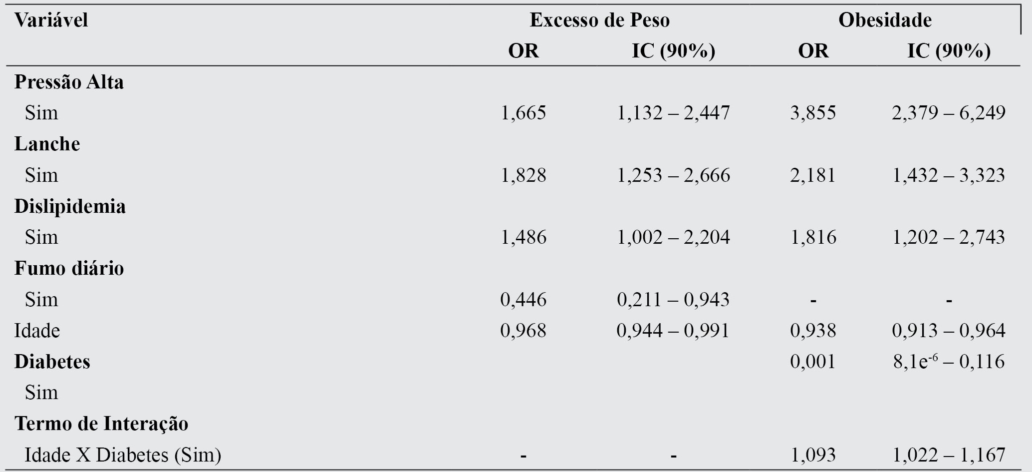 Observa-se que quem tem pressão alta, dislipidemia e hábito de substituir as refeições principais por lanche (cinco ou mais vezes na semana), tem maior chance de apresentar excesso de peso e obesidade. A probabilidade de ter excesso de peso diminui com o avançar da idade, assim como ser fumante diário (Tabela II).