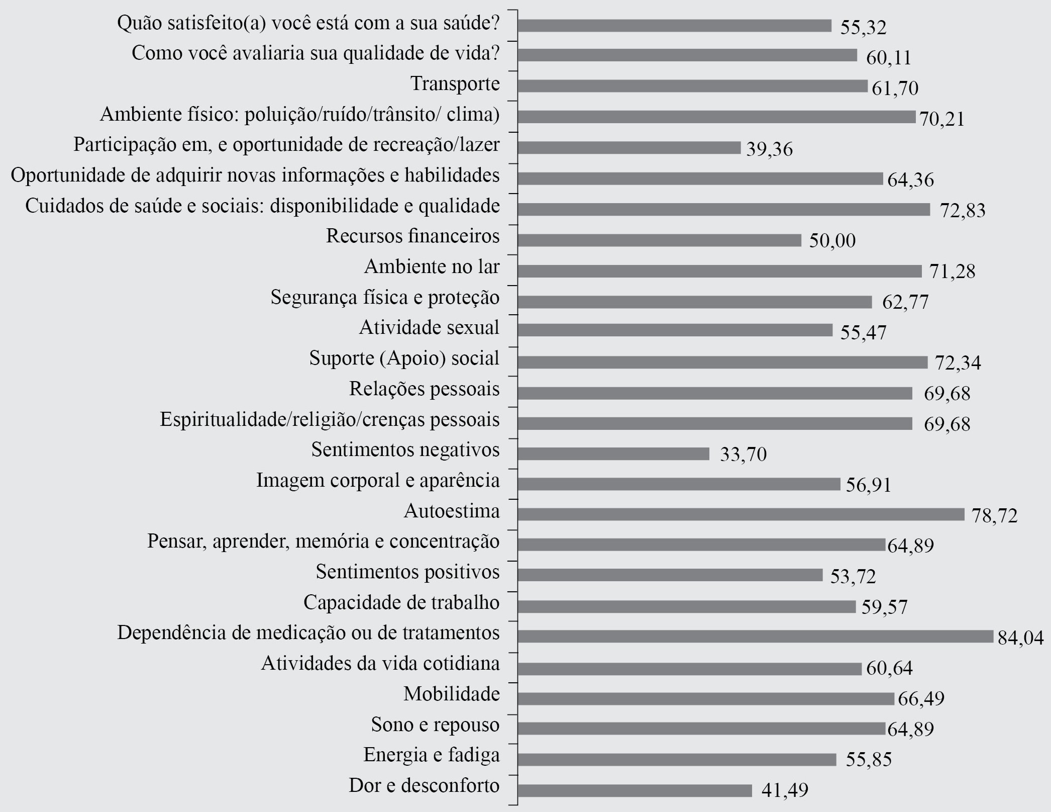 Em relação à qualidade de vida, verificou-se na presente pesquisa que todos os domínios apresentaram como resultado uma qualidade de vida de regular a boa, e que os maiores coeficientes de variação foram sobre a autoavaliação da qualidade de vida, domínio físico e domínio psicológico. O que significa dizer que, devido à grande variabilidade de dados desses domínios, a média da avaliação da qualidade de vida não se torna a mais alta. Os resultados obtidos da análise dos escores por facetas mostraram aspectos positivos e outros negativos em relação à qualidade de vida. Entre os negativos destaca-se que 41,49% dos indivíduos sentem algum tipo de dor ou desconforto relacionado ao cansaço e falta de energia. Isto pode ser reafirmado quando se analisa o escore de energia e fadiga relatadas pelos pacientes, o que interfere diretamente na execução das atividades básicas diárias.