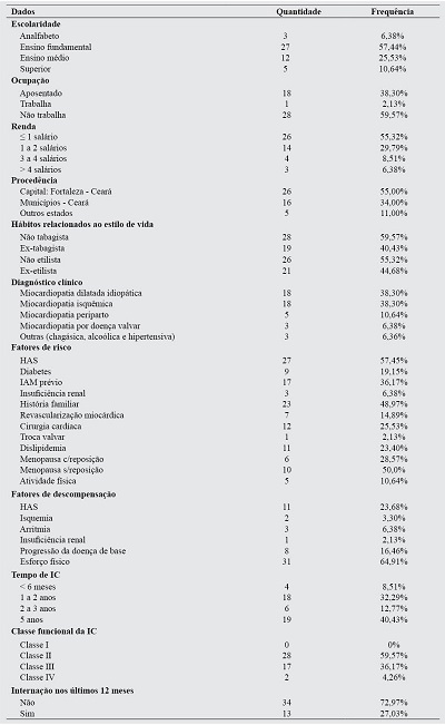 Uma pesquisa realizada com 170 indivíduos, que avaliou a qualidade de vida relacionada à saúde em idosos com IC, evidenciou que 83% dos indivíduos eram profissionalmente inativos, o que incluía desempregados, aposentados ou dependentes do auxílio doença(21). Já no presente estudo, quando somados os percentuais de indivíduos inativos (que não trabalham e aposentados), obteve-se um resultado de 97,87% (n=46) dos pacientes incluídos nesse grupo, o que pode ser justificado pela limitação que a doença traz, associada à dispneia e aos demais sintomas relacionados.