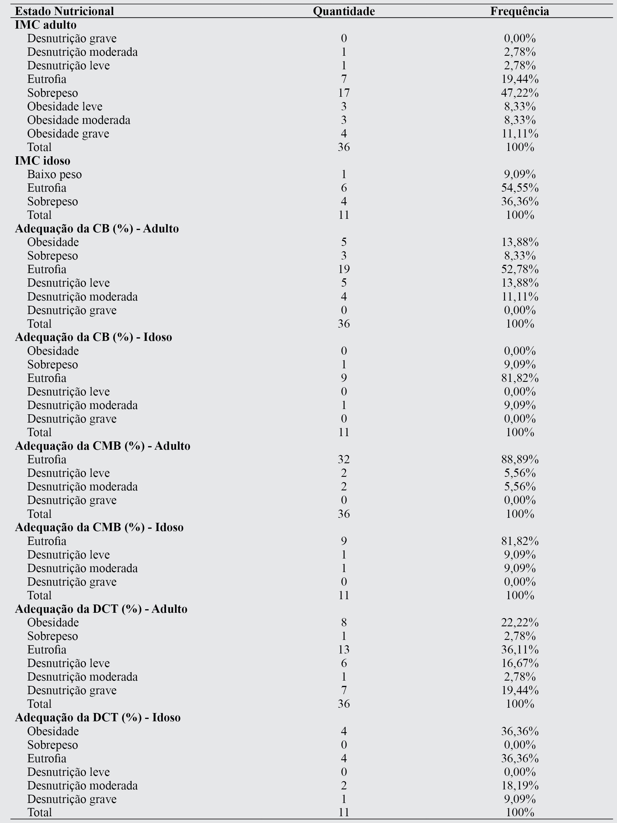 Os resultados de adequação das variáveis CB, CMB, e DCT também foram expressos por classificação etária para adulto e idoso. No caso da CB, 52,78% (n=19) dos adultos e 81,82% (n=9) dos idosos apresentaram maior prevalência de eutrofia. Em relação à CMB, foram 88,89% (n=32) dos adultos e 81,82% (n=9) dos idosos com eutrofia. Já para a DCT, embora não tenha predominado a eutrofia, houve uma parcela muito importante de eutrofia, de 36,11% (n=13) nos adultos e 36,36% (n=4) nos idosos (Tabela II).