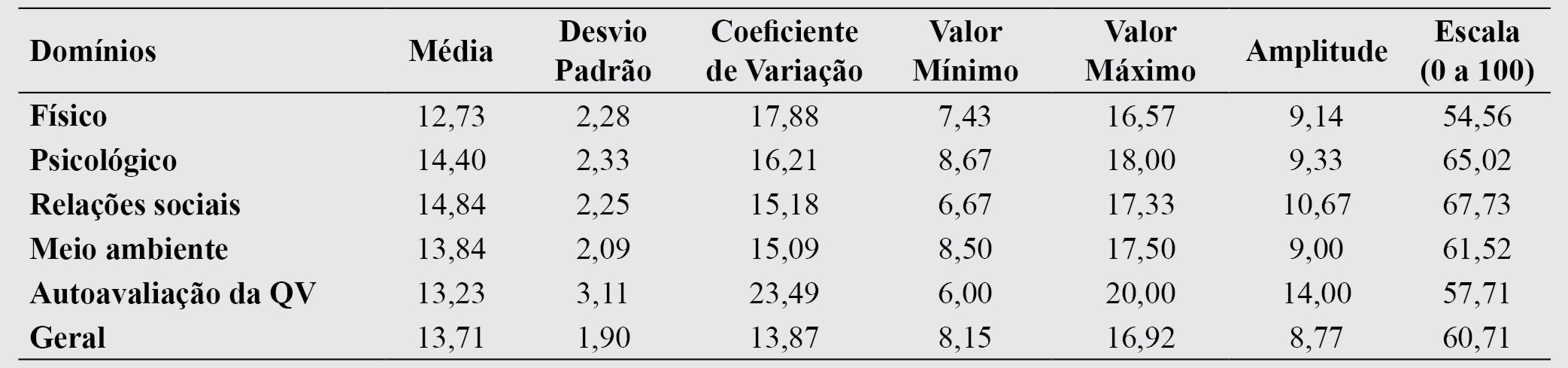 Para avaliação da qualidade de vida, utilizou-se o questionário estruturado e padronizado, o World Health Organization Quality of Life (WHOQOLBref), na versão abreviada e em português(14,15), que avalia também a percepção dos indivíduos a respeito do impacto que as doenças causam em suas vidas. O WHOQOL-Bref em sua versão final ficou composto por 26 questões fechadas. A primeira questão refere-se à qualidade de vida de modo geral, a segunda, à satisfação com a própria saúde e as outras 24 são representantes de cada uma das 24 facetas que compõem o instrumento original. Essas 24 questões são divididas em 4 domínios: físico (7 itens), psicológico (6 itens), relações sociais (3 itens) e meio ambiente (8 itens)(14).