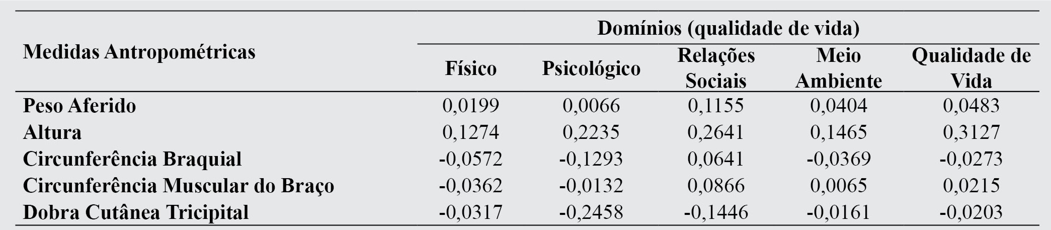 O coeficiente de correlação linear entre as variáveis qualidade de vida e medidas antropométricas mediu o grau da correlação (e a direção dessa relação - se positiva ou negativa). Os valores perto de -1 indicam que existe uma perfeita relação inversamente proporcional entre as variáveis, a proximidade da correlação a 1 indica que há uma perfeita relação linear diretamente proporcional entre as variáveis, e a proximidade da correlação de 0 mostra que não existe correlação linear entre as variáveis.