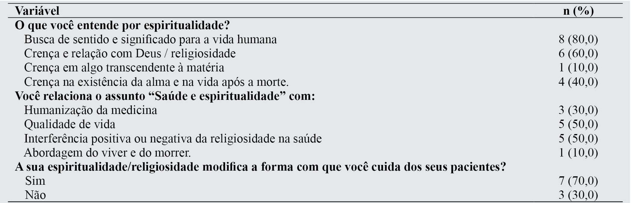 Foi possível perceber ainda que 90% dos entrevistados do estudo em questão acreditam em Deus e 50% frequentam alguma religião. Quando se trata da dimensão de religiosidade, os profissionais foram perguntados se “a sua espiritualidade/religiosidade modifica a forma com que você cuida dos seus pacientes” e 70% dos entrevistados relataram que sim. Dessa maneira, corrobora com a literatura quando se entende que a dimensão espiritual traz bem-estar, paz, tranquilidade, harmonia, compreensão e, sobretudo, valorização do ser humano que necessita de cuidados(26).