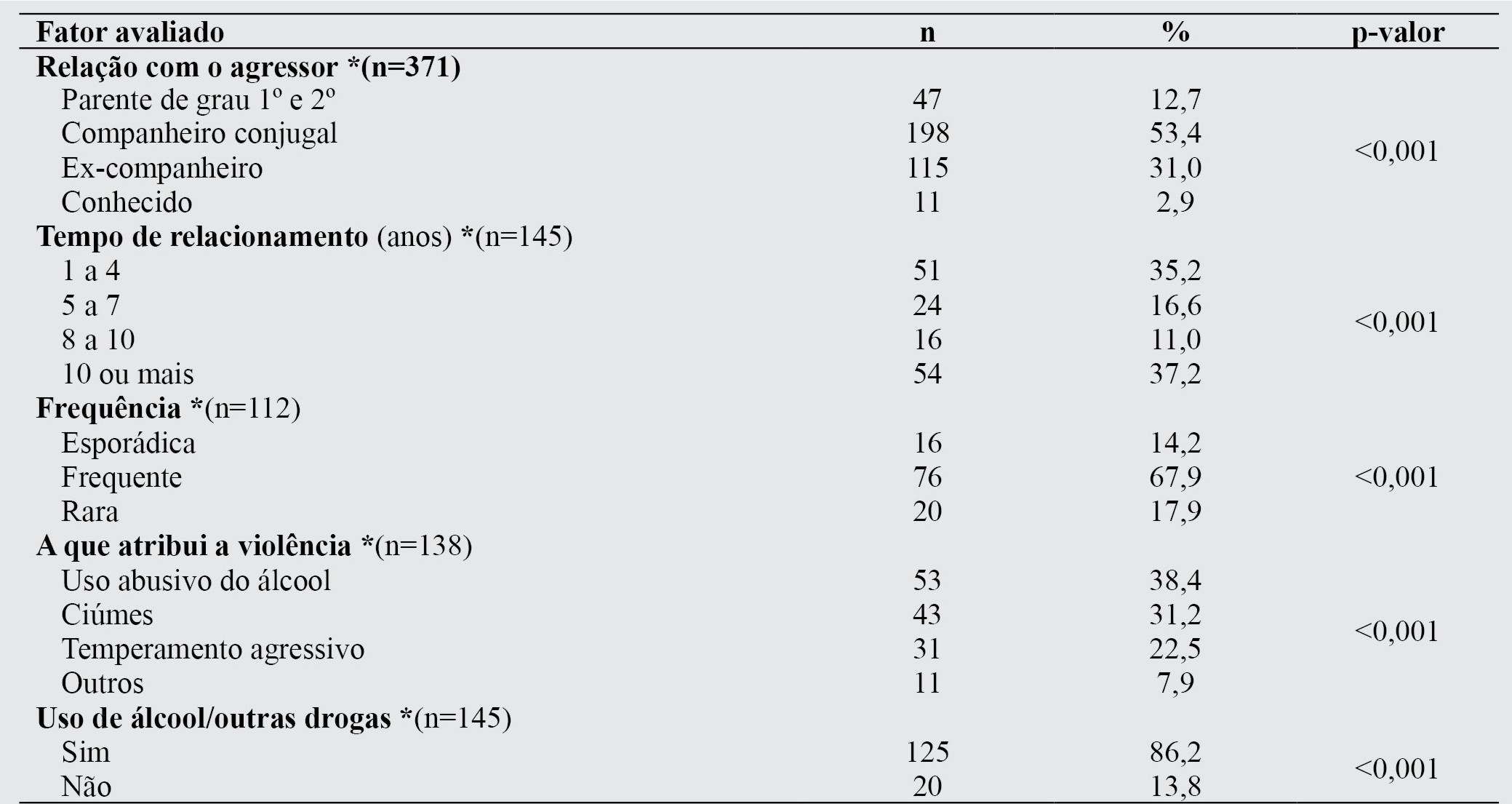 A maior parte das mulheres indicou os companheiros conjugais como agressores (53,4%, 198 casos). As mulheres que possuíam mais de 10 anos de relacionamento (37,2%, 54 casos) passaram por mais episódios violentos do que aquelas que apresentavam tempo inferior. As mulheres referiram sofrer violência frequentemente (67,9%, 76 casos), atribuindo a agressão ao uso abusivo do álcool (38,4%, 53 casos). Elas apontaram que o agressor costumava fazer uso rotineiro de álcool e/ou outras drogas (86,2%, 125 casos). O teste de comparação de proporção revelou-se significativo em todos os fatores avaliados, indicando frequência nos casos de violência conforme consta na Tabela III.