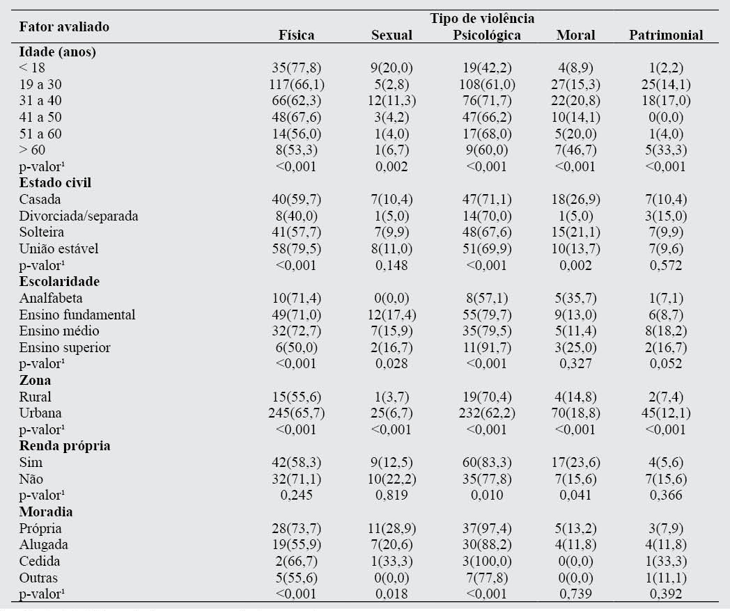 Quanto ao estado civil, as mulheres em união estável sofreram maior número de violência física (p<0,001). As casadas passaram por mais violência psicológica (p=0,002) e moral (p<0,001). Em relação à escolaridade, as mulheres que estudaram até o ensino fundamental sofreram mais violência sexual (p=0,028) e aquelas com ensino médio, a violência física (p<0,001). A maior prevalência da violência psicológica ocorreu em mulheres que possuíam nível superior (p<0,001).