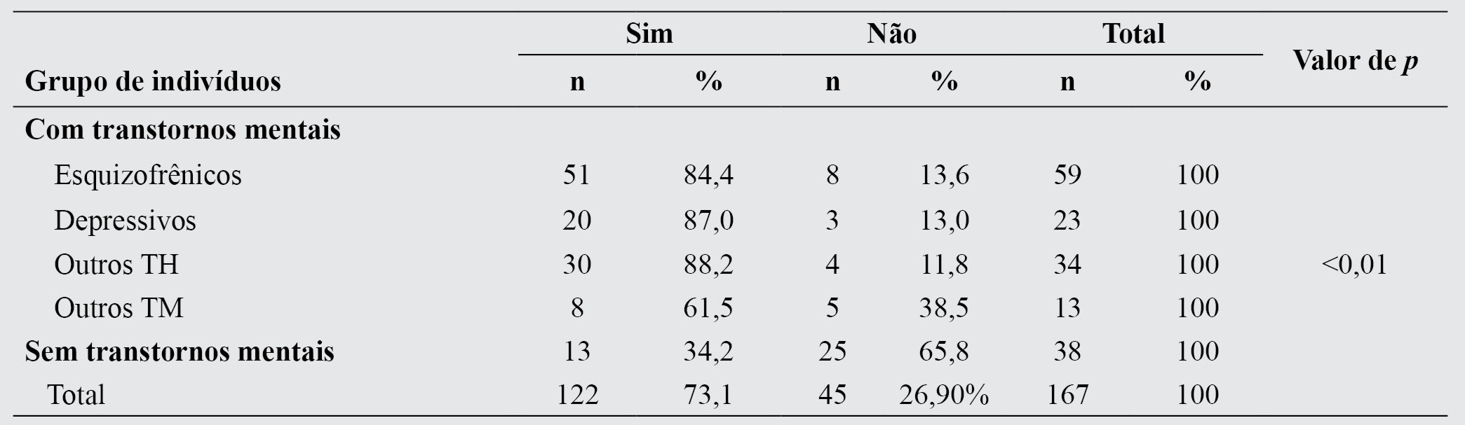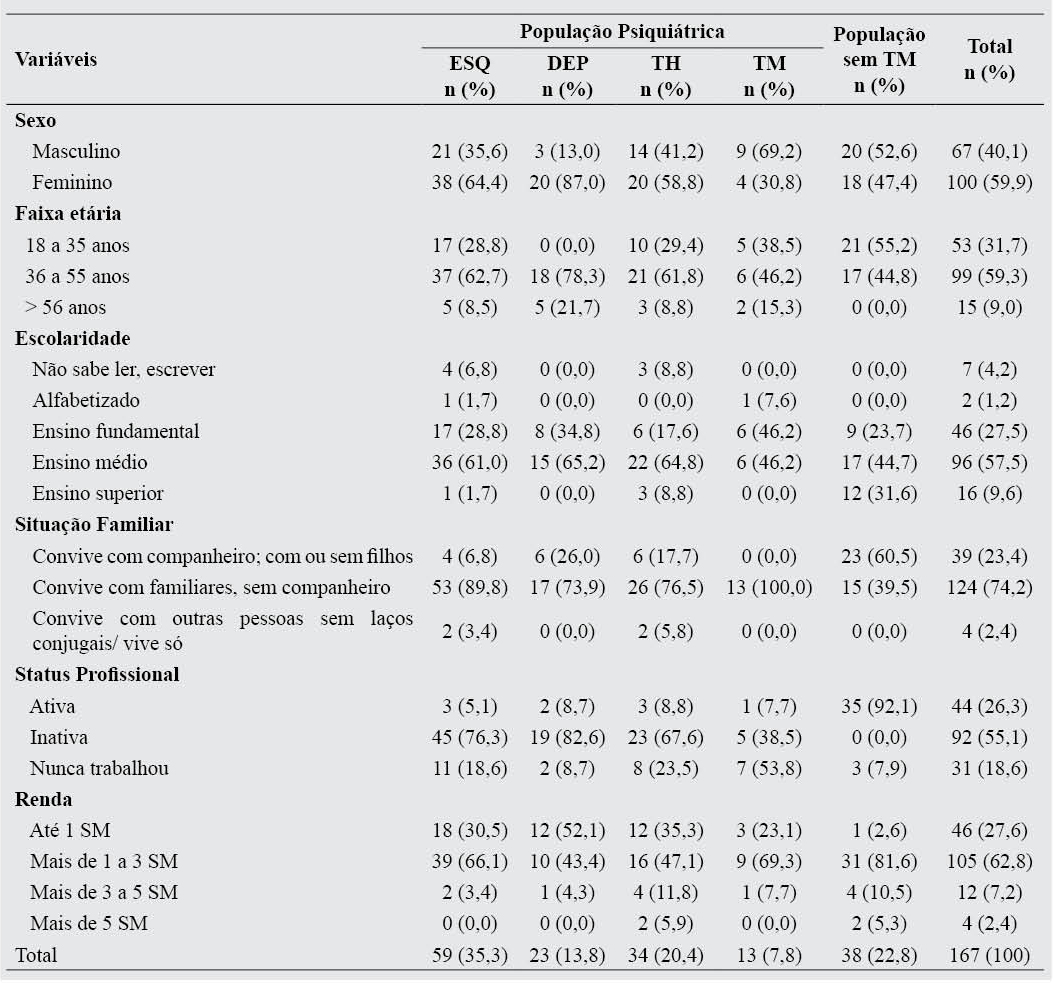 Participaram do estudo 167 pacientes, sendo 129 pertencentes à população psiquiátrica e 38 à população sem transtornos. Considerando-se o total de participantes, observou-se predomínio do sexo feminino (59,9%, n=100), faixa etária entre 36 a 55 anos de idade (59,3%, n=99), com ensino médio (57,5%, n=96), que conviviam com familiares e sem companheiro (74,2%, n=124), e renda familiar de 1 a 3 salários mínimos (62,8%, n=105). (Tabela I).