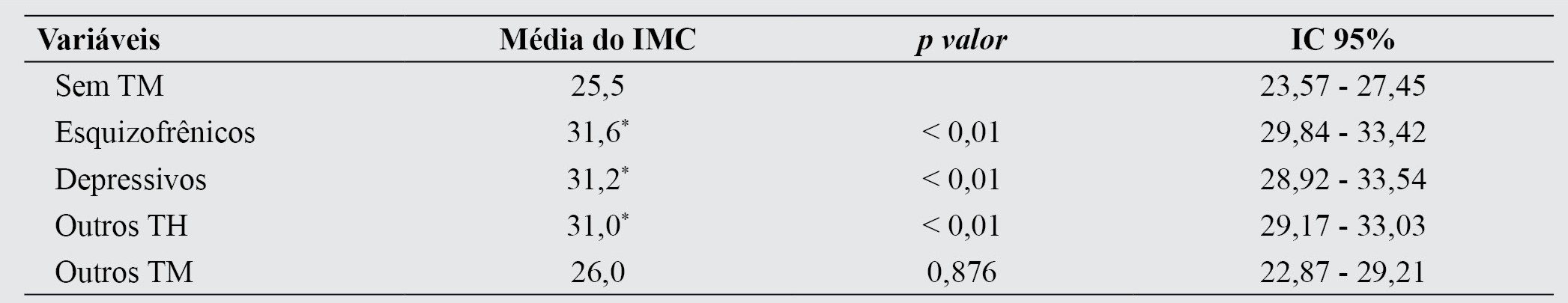 Quando se compararam as médias do IMC entre os grupos, foram observadas diferenças significativas entre indivíduos esquizofrênicos (=31,6, p<0,01), depressivos ( =31,2, p<0,01) e com outros transtornos de humor ( =31,0, p< 0,01) em relação à população sem transtornos (Tabela III).
