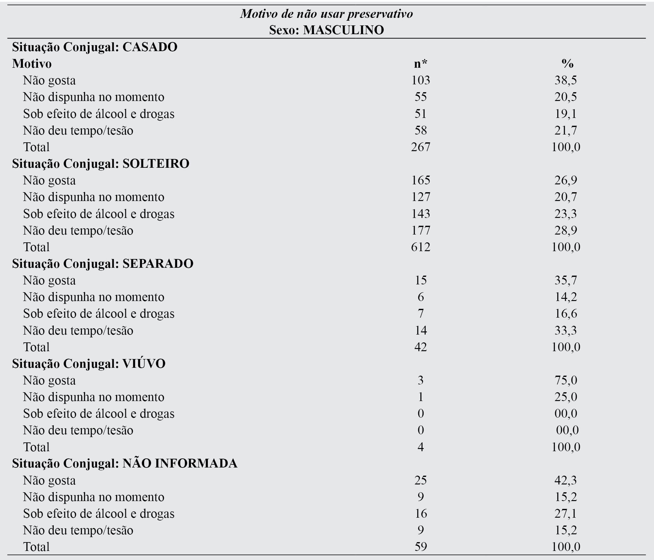 Em relação ao não uso do preservativo pelos indivíduos do sexo masculino, da Tabela I, apresenta “não gosta” como fator dominante em: 38,5% dos usuários autodeclarados casados, 26,9% nos usuários que se afirmaram solteiros, 35,7% entre os separados, 75% entre os viúvos e 42,3% no grupo dos homens que não informaram seu estado civil.