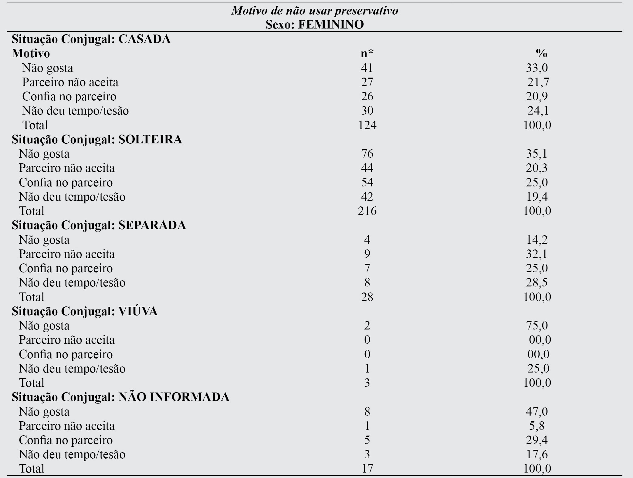 As Tabelas I e II mostram o motivo de não se usar preservativo com último parceiro eventual em relação ao sexo e ao estado civil, com um total de 1.372 ocorrências, distribuídas em 984 ocorrências na população masculina e 388 na população feminina, em que foram descritos somente os motivos com maior número de ocorrência.