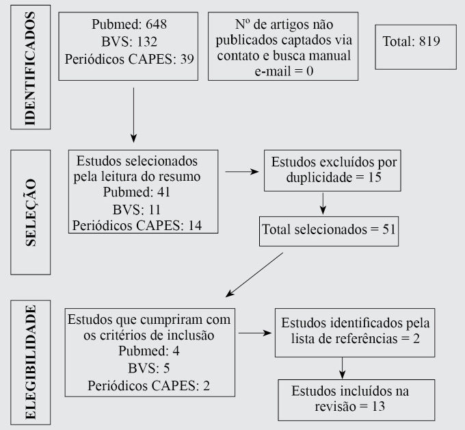 A estratégia de pesquisa bibliográfica permitiu identificar 819 artigos publicados no período entre 2006 e 2016. Após a leitura dos títulos, análise dos resumos e aplicação dos critérios de elegibilidade, incluíram-se 13 artigos à revisão sistemática. O número de artigos encontrados em cada base de dados de pesquisa está descrito na Figura 1