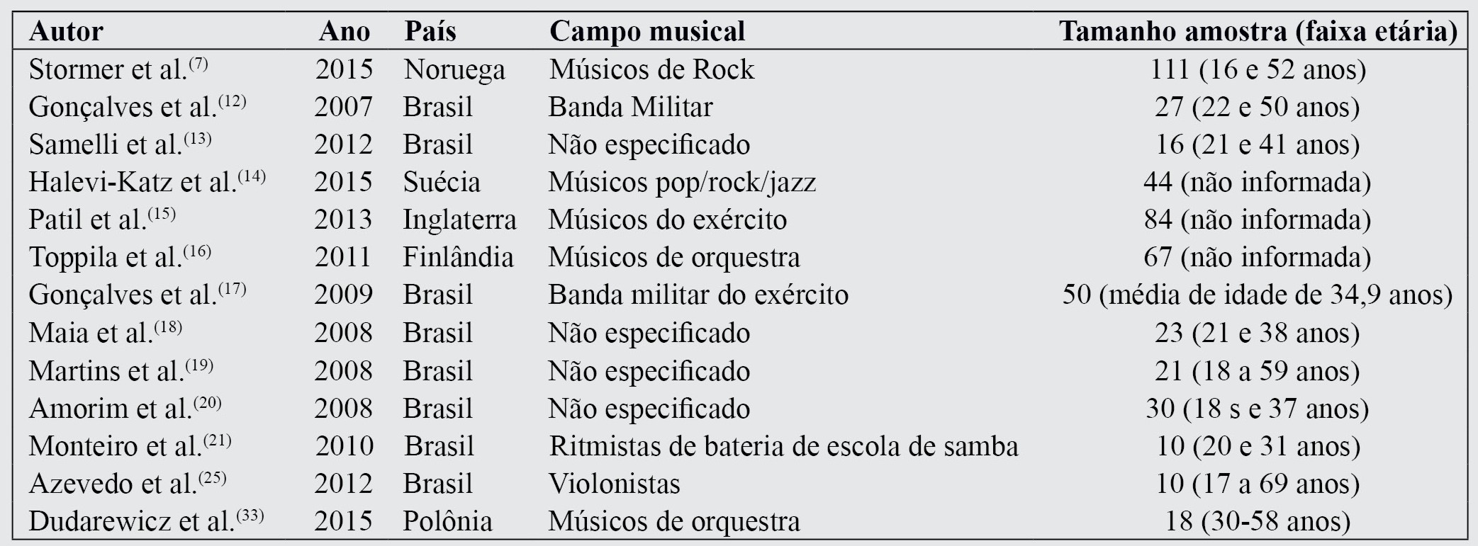 O Quadro I expressa os dados das características dos estudos referentes a autor, ano e país de publicação, campo musical, tamanho amostral e faixa etária da amostra. Aprecia-se que a maioria estudou adultos, de ambos os sexos, e na faixa etária entre 16 e 69 anos. Dois estudos avaliaram apenas homens(12,13). Os estudos foram desenvolvidos em diferentes países, sendo 64,28% no Brasil e os demais em países europeus (Noruega, Suécia, Polônia, Inglaterra, Dinamarca e Finlândia). O tamanho amostral dos estudos era heterogêneo e variou entre 10 e 111 participantes. Quanto à faixa etária da amostra, esta não foi informada por 3 pesquisas(14,15,16) e uma delas indicou apenas a média de idade dos participantes(17). Quanto ao campo musical, 14,28% eram músicos de pop rock/rock, 21,42% músicos de orquestra, 21,42% músicos de banda militar, 7,15% ritmistas de escola de samba, 7,15% violonistas e 28,58% (cinco artigos) não informaram esse dado.
