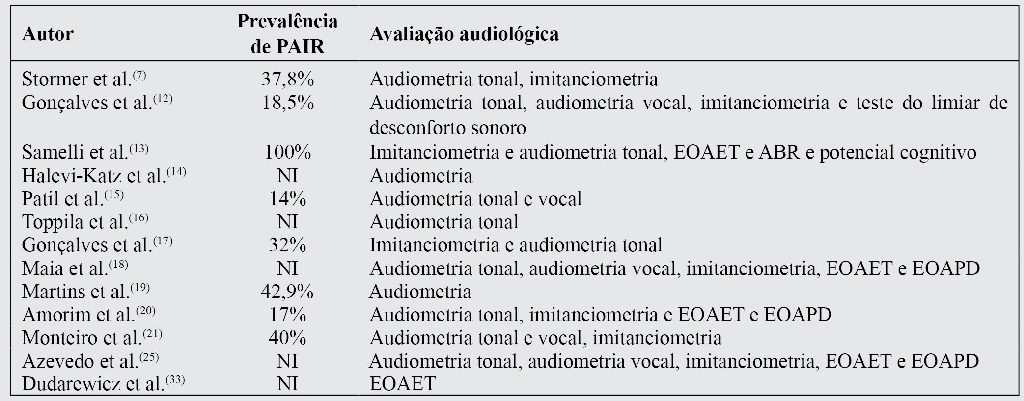 No Quadro II apreciam-se os dados da prevalência da perda auditiva induzida por ruído (PAIR) e método de avaliação audiológica. Observa-se que cinco estudos não informaram dados sobre a prevalência de perda auditiva. Dos estudos que informaram dados de prevalência(7,12,13,15,17,19,20,21), a soma dos participantes totalizou 349, dos quais 31,24% apresentaram PAIR. Em relação aos exames audiológicos usados para avaliar a audição, a audiometria tonal aparece em todos os estudos, seguida da imitanciometria, 21,42% das emissões otoacústicas evocadas por produto de distorção (EOAPD), 35,71% emissões otoacústicas evocadas por transientes (EOAET), e audiometria vocal.