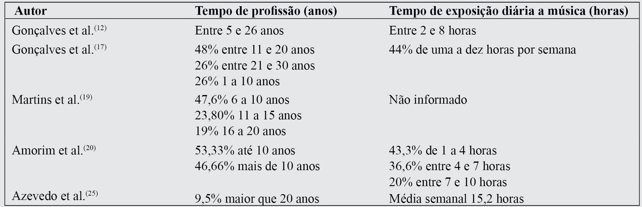 Na intenção de recompilar dados sobre a vida laboral e o uso de equipamentos de proteção individual (EPI), dos 13 estudos, somente cinco continham dados sobre o tempo de profissão(12,17,19,20,25) e apenas quatro(12,17,20,25) apresentaram dados do tempo de exposição diária à música, cujos dados estão detalhados no Quadro III. Somente um estudo afirmou que 100% dos entrevistados utilizavam protetores auriculares como EPI. Os demais estudos não forneceram esse dado(21).