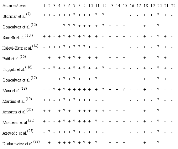 A avaliação da qualidade metodológica dos artigos selecionados foi realizada de acordo com os critérios estabelecidos pelas diretrizes STROBE (Strengthening the Reporting of Observational Studies in Epidemiology). Esse instrumento é constituído por 22 itens relacionados às informações que deveriam estar presentes no título, resumo, introdução, metodologia, resultados e discussão dos artigos. A Iniciativa STROBE foi elaborada por pesquisadores da área de epidemiologia, estatística e metodologia científica, e tem como objetivo disseminar os princípios que devem nortear a descrição de estudos observacionais. Decidiu-se avaliar qualitativamente com a classificação de “+”, “-” e “?”, de acordo com, respectivamente, a presença, ausência ou dados incompletos do critério estudado.