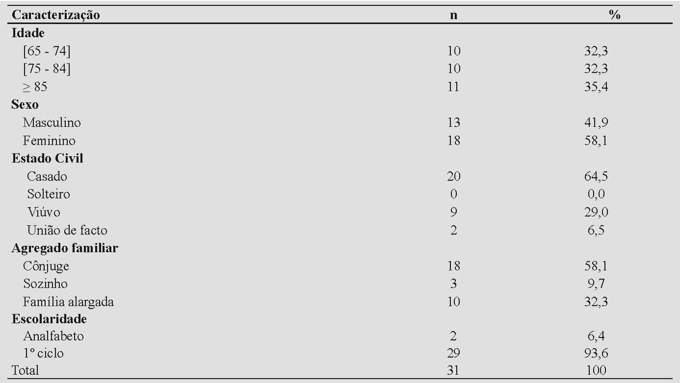 Dos 31 idosos, 35,4% (n=11) tem idade igual ou superior a 85 anos; 58,1% (n=18) são mulheres; 64,5% (n=20) são casados; 58,1% (n=18) vivem com o cônjuge e têm baixa escolaridade, com 93,6% (n=29) a ter somente o 1º ciclo (Tabela I).