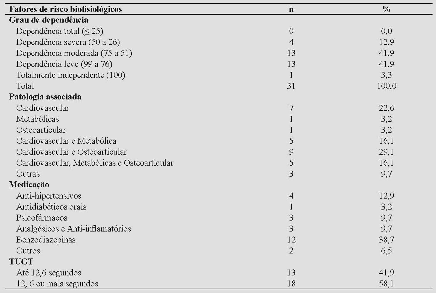 Nos fatores de risco de etiologia biofisiológica, destacam-se: a idade; a diminuição da velocidade de marcha; o grau de dependência moderado ou severo; a pouca confiança na realização das atividades; o consumo de benzodiazepinas e a polimedicação. Na avaliação ambiental ao domicilio, os investigadores observam que a iluminação só é adequada nas cozinhas, a totalidade dos idosos tem pelo menos um tapete em casa, a maioria tem a presença de um animal doméstico no interior da habitação e possuem, pelo menos, uma peça de mobília instável. Os comportamentos de segurança são baixos, uma elevada percentagem nunca foi alertada para os riscos de queda, nem pela família, nem pelos profissionais de saúde, e refere não ser perseverante na escolha das melhores medidas preventivas.