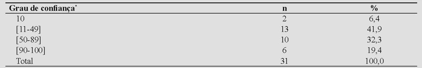 A análise da Tabela III, em relação à aplicação da FES, mostra que 41,9% (n=13) dos idosos apresentou pouca confiança e 6,4% (n=2) nenhuma confiança, o que aponta para quando a dificuldade percebida da realização da tarefa está diretamente relacionada com o sentimento de risco de queda.
