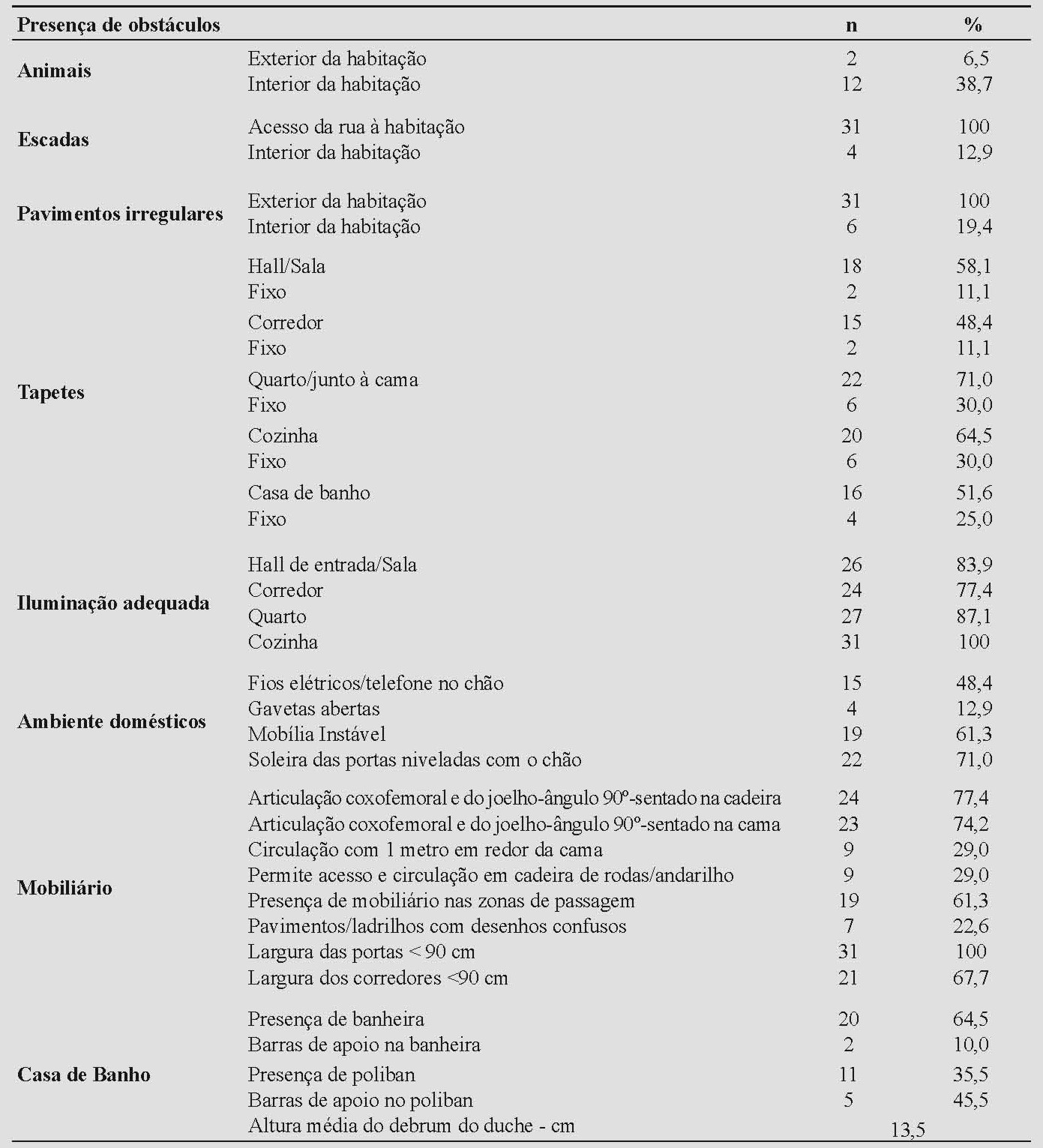 b) Avaliação da habitação: consideraram-se as seguintes dimensões – iluminação, tapetes e outros adereços que dificultem a marcha; presença de corrimões e barras de apoio. Na impossibilidade de aceder a outros instrumentos, foi utilizada um registo de observação de segurança do ambiente físico e barreiras arquitetónicas no domicílio adaptado da literatura(17).