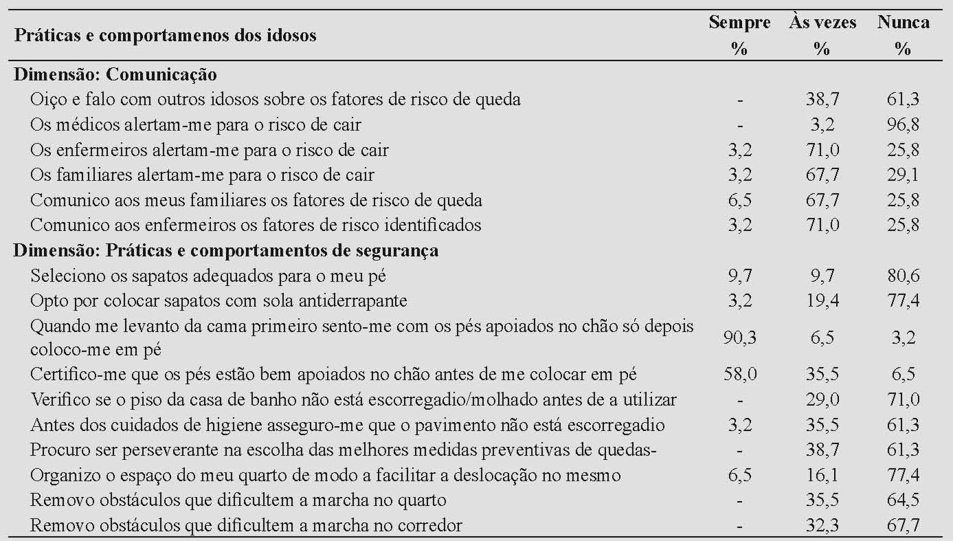 No que concerne à aplicação da escala de práticas e comportamentos do idoso na prevenção de quedas, constatou-se 96,8% (n=30) dos idosos referiram nunca terem sido alertados pelos médicos para o risco de queda; 71,0% (n=22) afirmaram que os enfermeiros às vezes os alertam para o risco de cair, assim como 67,7% (n=21) são alertados “às vezes” para esse risco pelos seus familiares; 61,3% (n=19) assumiram nunca terem ouvido ou falado com outros idosos sobre os fatores de risco de queda.