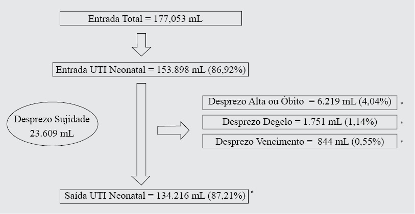 Os dados foram coletados das planilhas do setor ao longo do primeiro semestre de 2017, sendo estes: a) dados de entrada total de LM, em que se somou todo o volume coletado de LM de todas as mães que esgotaram no lactário no período e para todos os setores do hospital, sendo esse LM de mães de bebês internados na UTIN ou não; b) dados de entrada total destinada à UTIN, sendo o montante do volume de LM ordenhado somente pelas mães de bebês da UTIN; c) dados de saída do LM com destino à UTIN, referindo-se à quantidade de LM que foi ordenhado pelas mães de bebês da UTIN, foi armazenado pelo lactário e teve como fim a utilização na UTIN, não permanecendo estocado até o limite da validade, e d) dados de desprezo por data de validade expirada (> 15 dias congelado), por degelo vencido (> 12 horas descongelado)(14), por alta ou por óbito. Os dados de desprezo por sujidade foram coletados, porém, não permaneceram incluídos nas estimativas, pois não constam no registro de entrada, mas em outra planilha do setor.