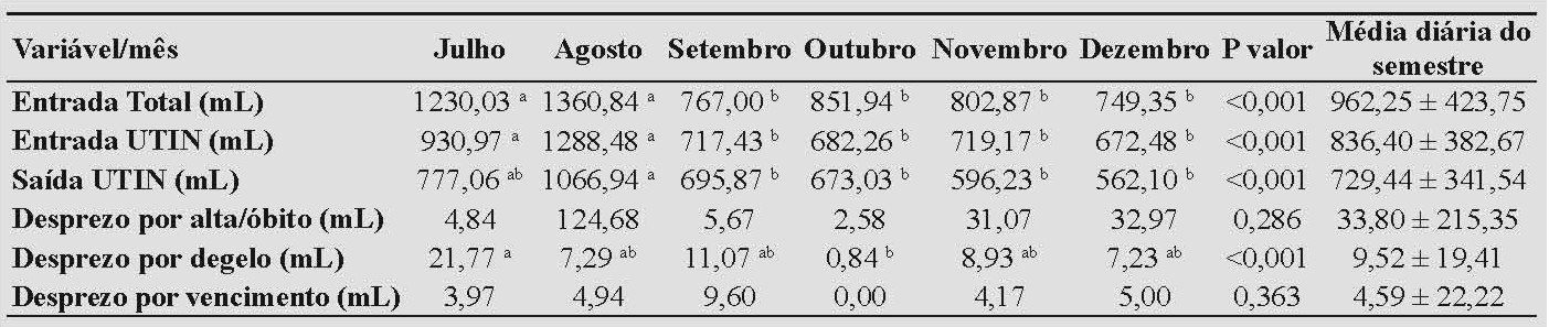 No desprezo por degelo, julho apresenta o maior volume (21,77 mL) e o mês de outubro, o menor (0,84 mL), quando comparados aos demais meses, sendo p<0,001. Os desprezos por alta/óbito e por vencimento não tiverem diferença estatística. As variáveis de desprezo não acompanharam o comportamento das variáveis de entrada total da UTIN e saída da UTIN proporcionalmente, pois dependem de altas e óbitos dos pacientes e da quantidade utilizada por recipiente de LM ordenhado.
