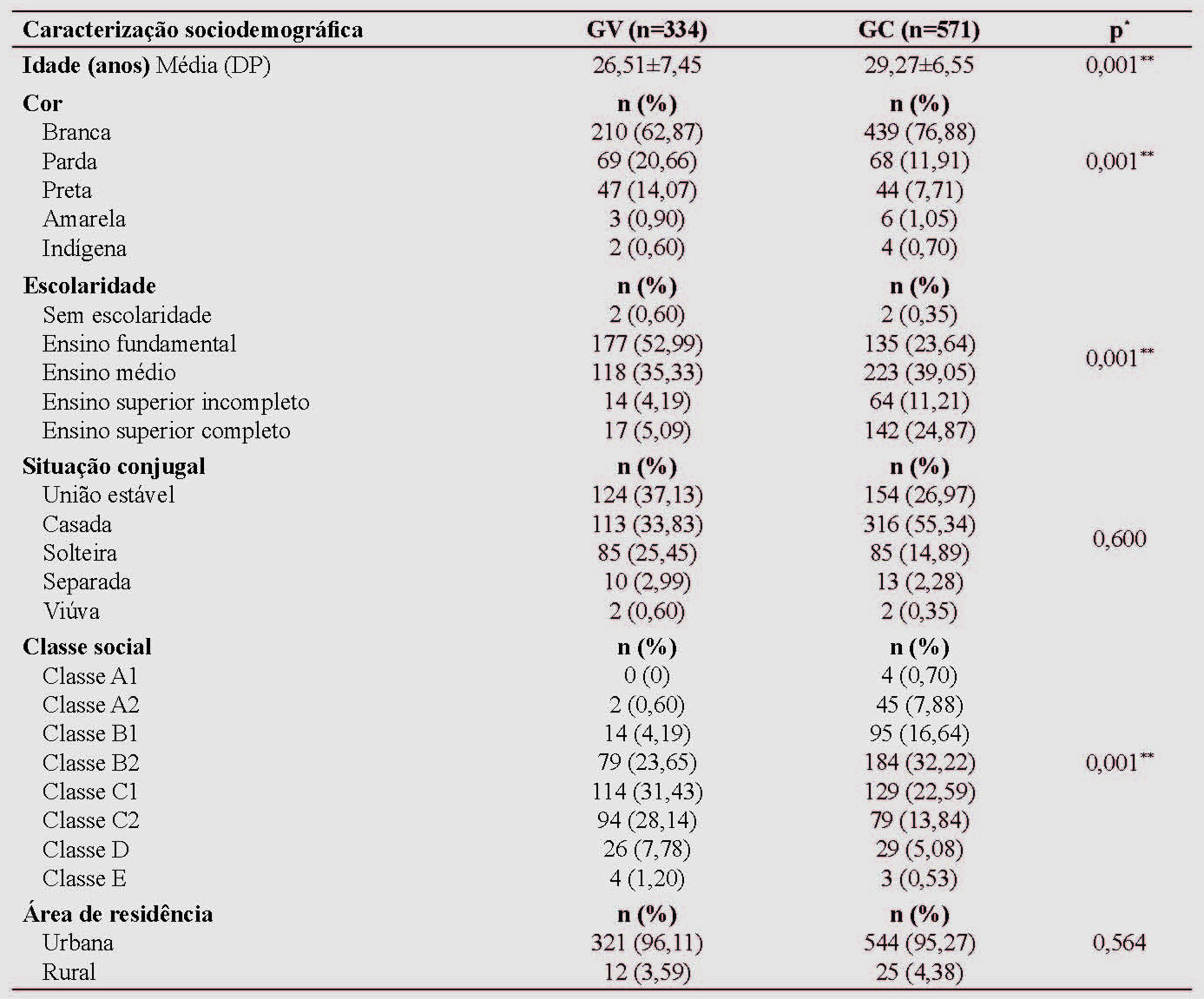 A maiorias das mulheres do GV era de cor branca (n=210; 62,87%), em união estável (n=124; 37,13%), com escolaridade no nível de ensino fundamental (n=177; 52,99%), pertencentes à classe social C1 (n=114; 34,13%) e residentes na área urbana (n=321; 96,11%). Já o GC constituiu-se de mulheres majoritariamente brancas (n=439; 76,88%), casadas (n=316; 55,34%), com escolaridade no nível de ensino médio (n=223; 39,05%), de classe social B2 (n=184; 32,22%) e residentes na área urbana (n=544; 95,27%) (Tabela I).