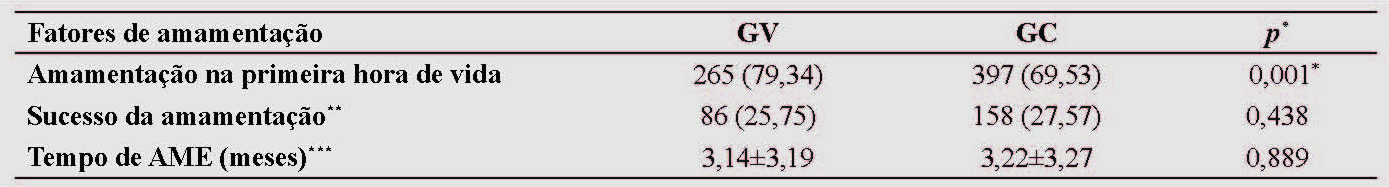 Na análise da relação da amamentação com a via de parto, encontrou-se diferença significativa somente para a amamentação na primeira hora de vida (p≤0,001), como apresentado na Tabela II. Isto refletiu em maior número de bebês sendo amamentados na primeira hora entre as mães do GV comparadas às mães do GC. Já no que diz respeito às variáveis “sucesso na amamentação” (considerando sucesso na amamentação a AME durante seis primeiro meses de vida do bebê) e “tempo de AME”, não foi encontrada associação com a via de parto e, em ambos os grupos, encontraram-se baixos índices de sucesso na amamentação e baixa média do tempo de AME.