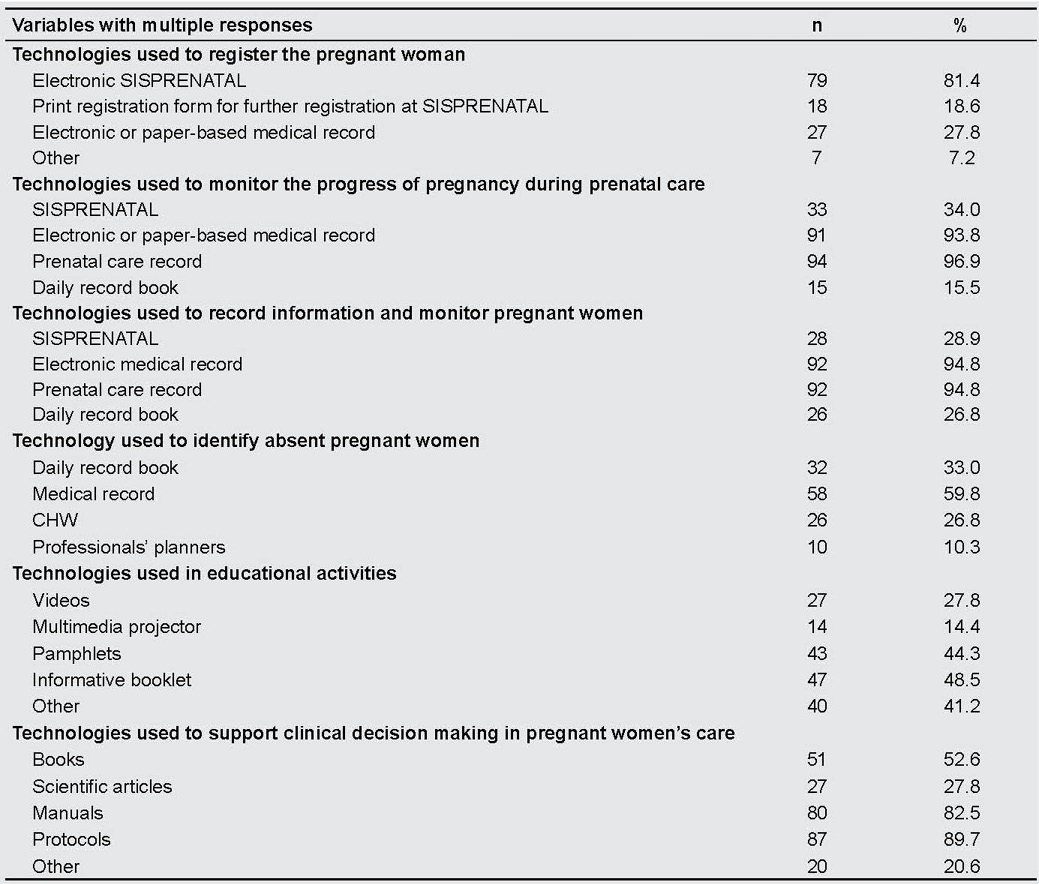 The electronic medical record (93.8%; n=91) and the prenatal record card (96.9%; n=94) were the main technologies used by nurses to monitor the progress of pregnancy during prenatal care (Table I).