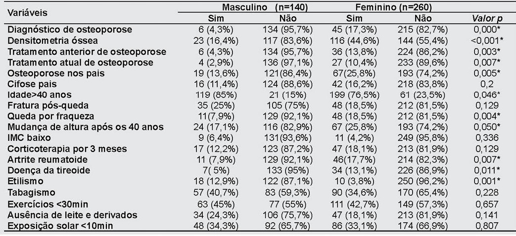 Participaram do presente estudo 260 mulheres e 140 homens (220 adultos e 180 idosos), com mediana de idade de 57 anos, sendo máximo de 82 anos e mínimo de 32 anos. Aproximadamente 95%, de ambos os sexos, respondeu afirmativamente a uma questão do teste pelo menos, indicando a presença de fatores de risco clinicamente comprovados para osteoporose.