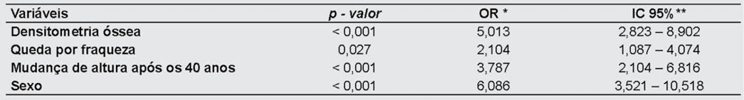 Ao se controlar o efeito das variáveis em conjunto pelo modelo de regressão logística binária, observou-se uma associação entre os fatores de risco densitometria óssea, queda por fraqueza, mudança de altura após os 40 anos e sexo no que diz respeito à população em estudo acima de 60 anos, conforme descrito pela Tabela II.