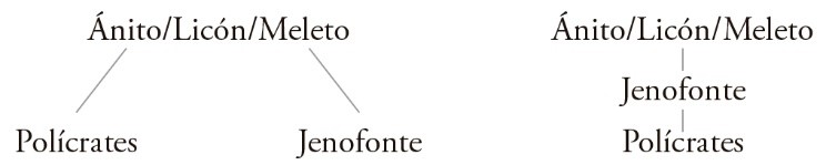 Este modelo está basado en la suposición directa de que ὁ κατἡγοροϛἔφη se refiere al acusador en 399 y no a un ataque póstumo y literario a Sócrates. Pero, incluso, por el bien de la discusión, adoptamos la visión aceptada y asumimos que en su Memorabilia, Jenofonte se muestra en contra de Polícrates, el resultado es más o menos el mismo: la presunción de que las acusaciones discutidas por Polícrates en su tratado no fueron inventadas por él, sino que se basaron en efecto en lo dicho en el 399. En este caso, la relación entre las fuentes es la siguiente: