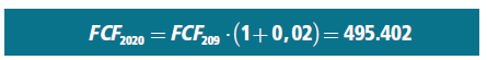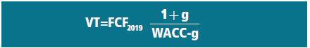 Consideramos que a partir del año 2019 las empresas están en una época de estabilidad y el crecimiento esperado del Free Cash Flow es del 2%, que corresponde con la inflación prevista, por lo que el flujo del año 2020 será igual al flujo del año 2019 multiplicado por 1+g, siendo g la tasa de crecimiento anual acumulativo, en nuestro caso: