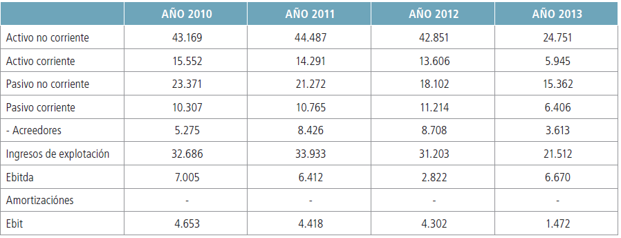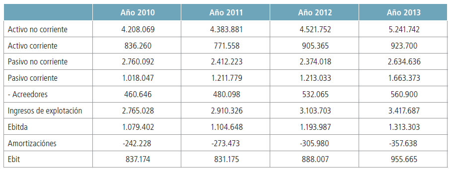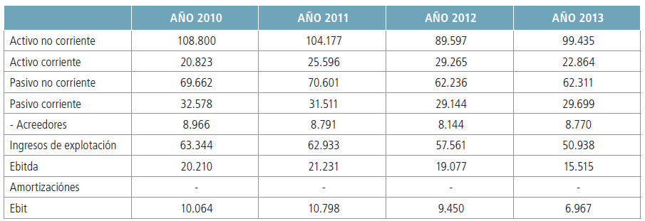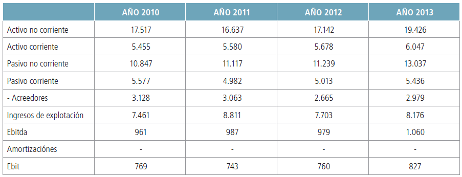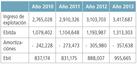 (2 Ratio EBITDA / INGRESOS DE EXPLOTACIÓN para el periodo 2010-2013 y proyección a los cinco años siguientes mediante medias móviles de orden cuatro. Multiplicando esta ratio por los INGRESOS DE EXPLOTACIÓN, se estima el EBITDA para el periodo 2014-2018.
