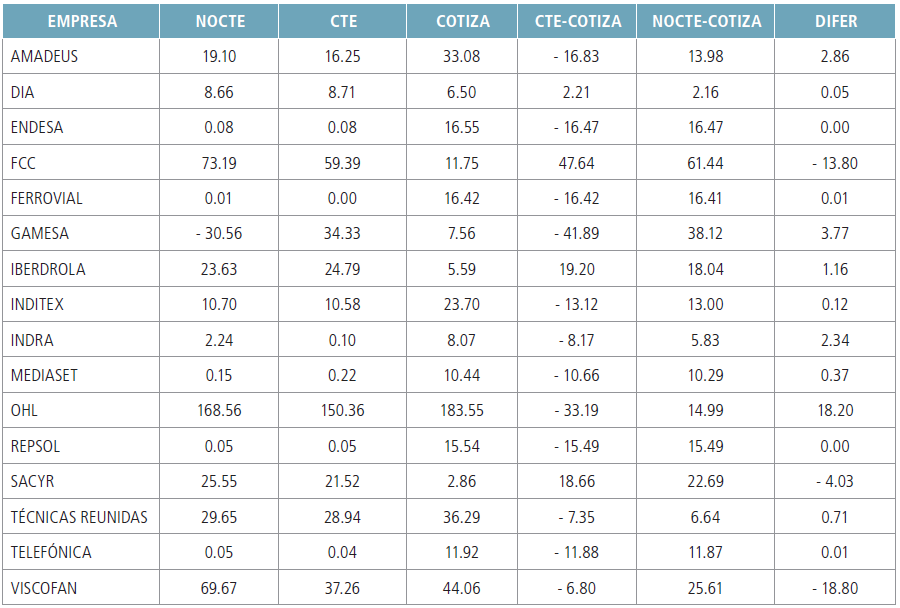 La variable DIFER representa la mejora del método NoCTE respecto del método CTE, pues si toma valores positivos significaría que el método NoCTE mejora la predicción, es decir, se aproxima más a la cotización. Se observa que en 13 de las 16 empresas la variable es positiva.