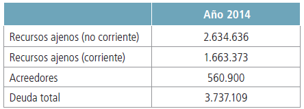 El siguiente paso es determinar el valor de la deuda y para ello sumamos el valor de los RECURSOS AJENOS NO CORRIENTES con los RECURSOS AJENOS CORRIENTES en el año 2014 y a este valor le descontamos los RECURSOS AJENOS que no tienen coste, es decir, los Acreedores del mismo año (Tabla 2). Al no tener ninguna referencia sobre la evolución de la deuda en las distintas empresas consideramos esta partida constante hasta el año 2019, después crecerá esta cifra el 2% como ya se ha mencionado.
