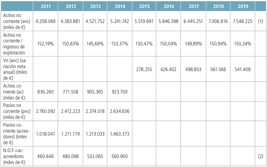 (1) Ratio ACTIVO NO CORRIENTE /INGRESOS DE EXPLOTACIÓN para el periodo 2011-2014 y proyección a los cinco años siguientes mediante medias móviles de orden cuatro. Multiplicando esta ratio por los INGRESOS DE EXPLOTACIÓN, se estiman el ACTIVO NO CORRIENTE y sus variaciones netas de cada año respecto del anterior, para el periodo 2015-2019.