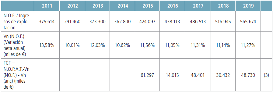 (3) Cálculo del Free Cash Flow restando al N.O.P.A.T., las variaciones netas anuales del ACTIVO NO CORRIENTE y de las N.O.F.