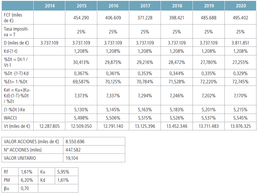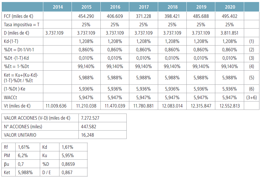 En este modelo existe una relación de dependencia del FCF con el valor de la empresa como se ha mencionado anteriormente. No podemos suponer que el coeficiente de endeudamiento permanece fijo en el periodo de tiempo considerado, pues depende del valor de la empresa de cada ano y viceversa, el valor de la empresa necesita del coeficiente de endeudamiento para su cálculo, por lo tanto, las operaciones detalladas en la Tabla 6, presentan una circularidad.