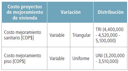 El costo de ejecución de los proyectos de mejoramiento de vivienda contemplado dentro del flujo de caja para el análisis financiero y de riesgo es el mismo determinado mediante la simulación por dinámica de sistemas, y cuyos valores se resumen en la Tabla 2.