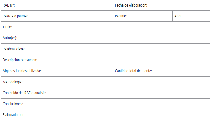 En esta etapa también se diseñó una matriz de resumen analítico especializado (RAE), en la que se tomó como punto de partida la presentada por Correa & Valbuena. (2012), y la matriz de antecedentes de investigaciones anteriores (MAIA), expuesta por Tafur & Izaguirre (2015, pp. 134-138). La matriz RAE utilizada en esta investigación es la siguiente: