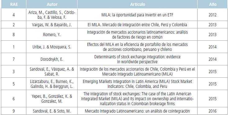 En la etapa de clasificación se elaboraron los resúmenes analíticos especializados para cada uno de los nueve artículos seleccionados que hacen referencia al Mercado Integrado Latinoamericano. El RAE utilizado es el que se muestra en la tabla 1.