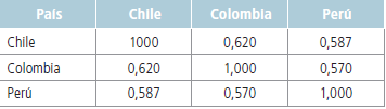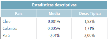 Los estadísticos muestran que, en promedio, Perú ha presentado rendimientos negativos, a la vez que sus acciones suponen un mayor riesgo. Mientras que Colombia, en promedio, ha mostrado los mayores rendimientos y representa el menor riesgo entre los tres países. La matriz de correlaciones reoeja que, aun cuando la correlación más baja se da entre Colombia y Perú (0,570), el análisis es apropiado porque todas las correlaciones son superiores a 0,5. Esto significa que el proceso de integración ha sido adecuado.