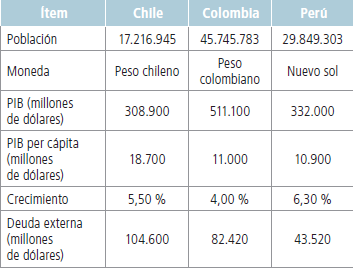 Lizarzaburu, Burneo, Galindo & Berggrun (2015) determinan el impacto que el MILA genera, o generó, en los mercados de valores de los países miembros de este. Evaluaron los principales índices de ellos, con indicadores como rentabilidad anual, desviación estándar, coeficiente de correlación y volumen de operaciones. Todo esto, entre noviembre de 2008 y agosto de 2013. Adicionalmente, hicieron una comparación de la economía de los tres países, de la cual se extrae la información presentada en la Tabla 5.