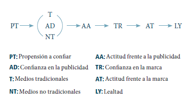 El modelo planteado en la investigación se comprueba gracias a las correlaciones positivas entre todos los conceptos que lo componen, lo que demuestra una secuencia causal entre cada uno de dichos elementos, siendo la propensión a confiar el concepto inicial de la cadena y la lealtad de marca el final. De otra parte, y dada la diferencia hallada entre el estudio de Ketelaar y Konig (2011) y el presente; se evidencia una situación atribuible a las diferencias entre las muestras seleccionadas para cada estudio. Mientras el estudio de Ketelaar y Konig (2011) indica la existencia de una relación inversamente proporcional entre quienes confían en medios tradicionales y quienes confían en los no tradicionales, el presente estudio obtuvo una relación directamente proporcional entre dichos medios, puede entenderse que la confianza, particularmente en los distintos medios de comunicación publicitarios, varía dependiendo de la cultura en la que se desarrolle la investigación.
