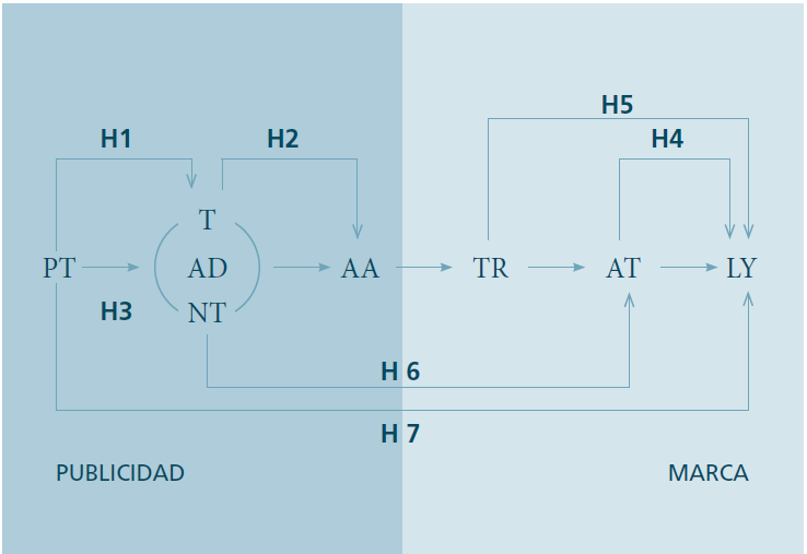Entendiendo esta serie de conceptos como una secuencia de eventos interrelacionados en el que cada uno tiene influencia en el siguiente se ha dividido el modelo en dos grandes bloques, el primero hace referencia al constructo publicidad y el segundo al de marca, ambos basados en un elemento en común: la confianza. Para validar el modelo se evaluaron relaciones dentro de cada uno de los bloques y posteriormente, relaciones interbloques, para comprobar la causalidad entre cada uno de los constructos.